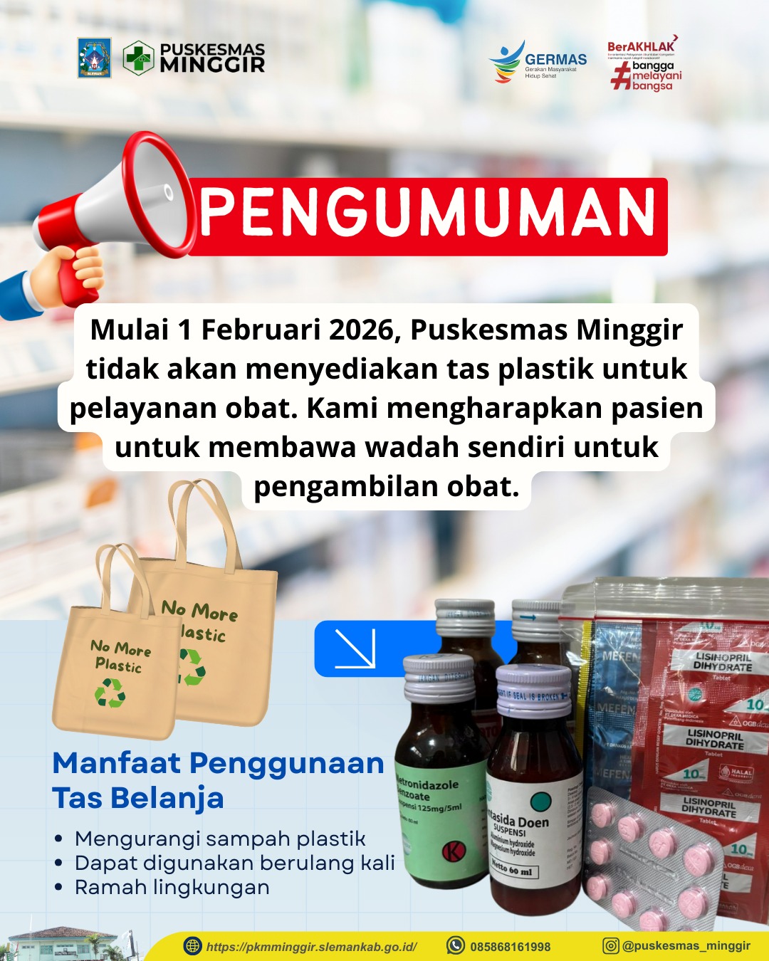 Mulai 1 Februari 2026 pemberian obat di pelayanan farmasi Puskesmas Minggir tidak menyediakan plastik.